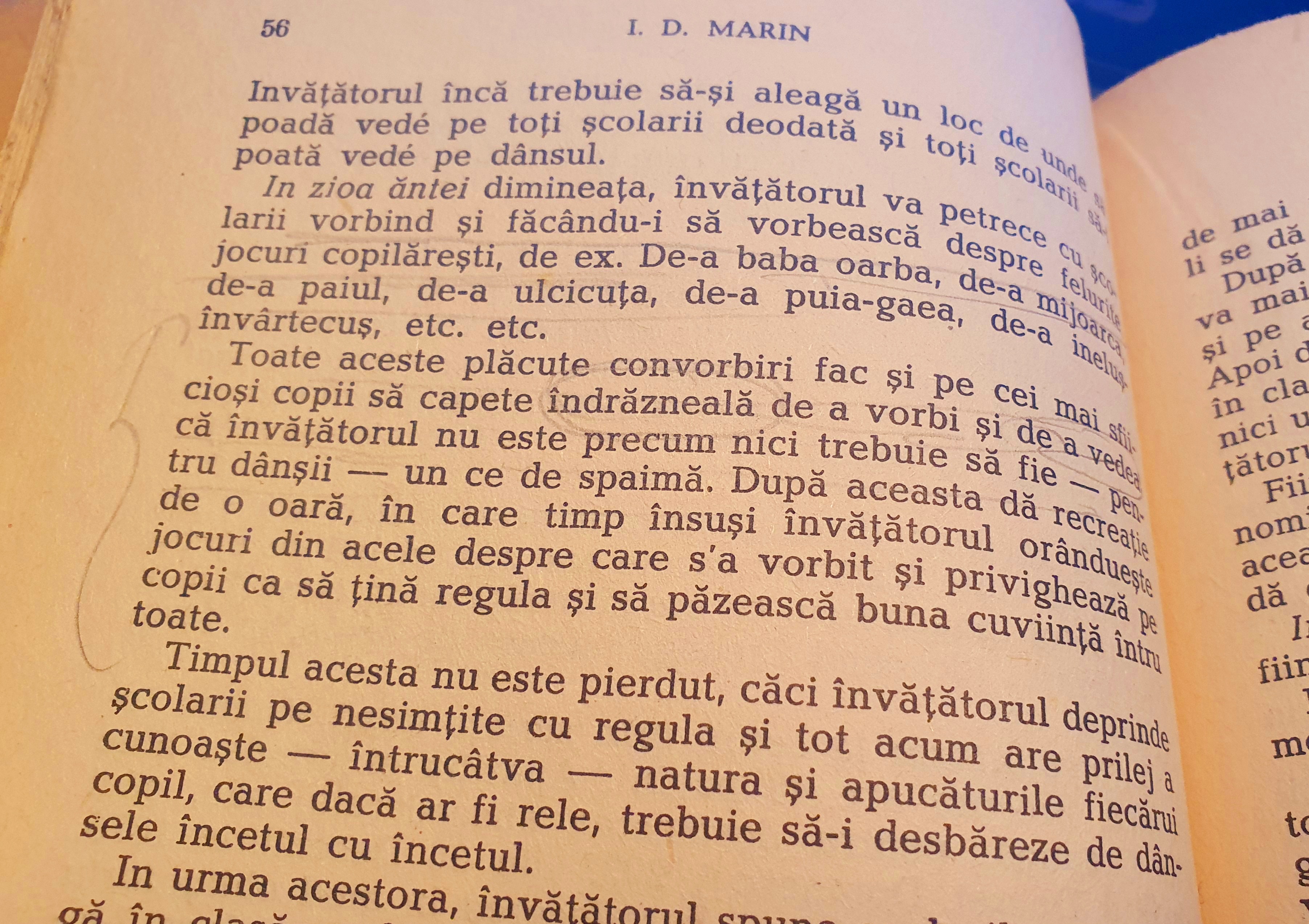 „…dimineața, învățătorul va petrece cu școlarii vorbind și făcându-i să vorbească despre felurite jocuri copilărești […]